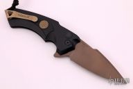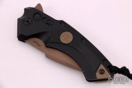 The X5 by Hogue Knives and SigSauer, features a bronze coated spear point blade made from CPM-154 steel. The handle is black anodized aluminum. Includes a bronzed stainless steal, reversible clip, tip up carry. The knife has a forward fire safety. There is a lanyard hole towards the butt of the knife. Includes original papers and padded zippered case with an extra clip. Has a few scuffs, otherwise good condition.