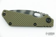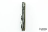 This SNG framelock folder by Mick Strider features a stonewashed blade and a dimple pattern green G-10 and flamed titanium frame and tip up titanium clip. Includes a "Lock Bar Stabilizer" for maximum reverse lock retention. Nice detent, lockup and blade seating. New condition.