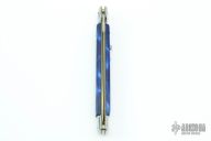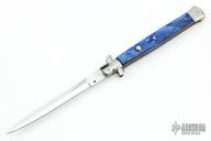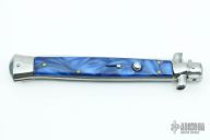 This Swivel Bolster from ACK Italy features a polished blade. The handle is comprised of stainless steel bolsters and pommel and blue pearlex scales over brass liners and steel backspacer. Has a couple light scratches, otherwise excellent condition. Comes with original and sheath.