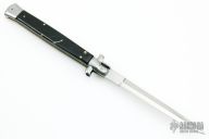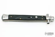 This Swivel Bolster from ACK Italy features a polished blade. The handle is comprised of stainless steel bolsters and pommel and black/white scales over brass liners and steel backspacer. Has a couple light scratches, otherwise excellent condition. Comes with original and sheath.