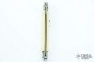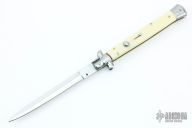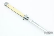 This Swivel Bolster from ACK Italy features a polished blade. The handle is comprised of stainless steel bolsters and pommel and white scales over brass liners and steel backspacer. Has a couple light scratches, otherwise excellent condition. Comes with original and sheath.