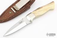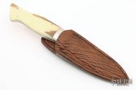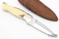 This Dagger by Robert Papp features a mirror polished double edged blade with satin flats, dovetailed nickel silver bolsters, and walrus ivory scales, .190" blade thickness and 1" blade depth, full tapered tang construction. Comes with a brown leather sheath with boot clip. Has a few light scratches, the scales have shrunk a bit and one of the scales has a little separation from the tang at the butt, otherwise excellent condition.