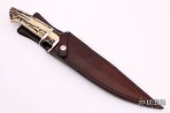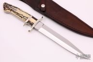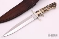 This Sub-Hilt Fighter by Pat Crawford has a mirror polished clip point blade with sharpened top edge, .242" blade stock and 1.241" blade depth, full tapered tang construction. The handle has a nickel silver double guard and sub-hilt, stag scales with red liners and nickel silver pins. Comes with a brown leather sheath. Has a few light scratches, otherwise excellent condition. #36