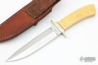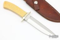 This Fighter by PF Beck features a mirror polished double edged blade with .202" blade stock and 1.173" blade depth, full tapered tang construction. The handle has a nickel silver guard, yellow paper micarta scales with black liners. Comes with a brown leather sheath. Has a few light scratches, otherwise excellent condition. #475 on underside of ricasso.