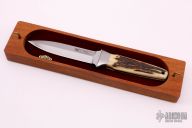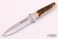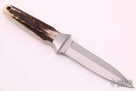 This Model 24 Madeline by Bob Terzuola features a hand rub satin finished double edged blade, .175" blade stock and .985" blade depth, full tapered tang construction. The handle has satin finished fine silver bolsters and pins with stag scales and a lanyard hole. Comes with original box and COA. Excellent condition.