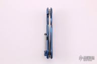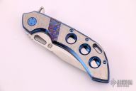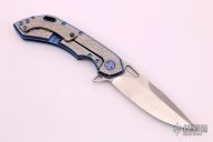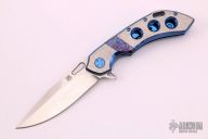 This Wayfarer 247 from Olamic Cutlery features a satin finished blade with swedge, thumbhole, notched thumb rest and flipper. The titanium handle scales are jeweled and anodized and have a black timascus inlays, floating jeweled titanium backspacer and matching titanium pocket clip is positioned for tip up carry with a ceramic ball inlay. The Wayfarer 247 is very comfortable in the hand and flips well with no wrist action needed. Blade is centered when closed and locks up with no play. Comes with zippered case and maker's card with a serial number of 1160 and dated 07-25-18. Excellent condition.