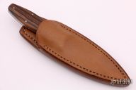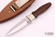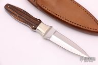 This Boot Dagger by DM Dent features a mirror polished double edged blade, .146" blade thickness and .760" blade depth, full tapered tang construction. The handle has nickel silver bolsters, wood scales and black liners. Comes with brown leather sheath with boot clip. Excellent condition.