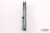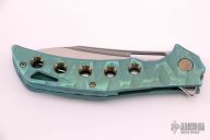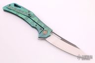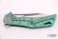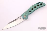 This Swish Flipper from Olamic Cutlery features a satin finished clip point blade with milled fullers, thumb hole and flipper. The handle is comprised of a tumbled and anodized titanium frame over an anodized floating titanium backspacer. Matching titanium tip up clip with ceramic ball. Screws and pivot have been anodized. Great detent, lock up and blade seating. Marked "Swish S438" inside the backspacer. Includes padded and zippered case, Olamic pivot tool and maker's card dated 12/4/18. Excellent condition.