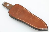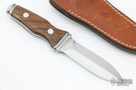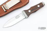 This is a very attractive boot knife from AG Russell. This is the older model made in Solingen, Germany. Blade is .105" thick and .918" deep at the ricasso and double-edged. Scales are rosewood. Integral construction with aluminum pins. Comes with brown leather sheath with clip. Has a few very light scratches, otherwise excellent condition.