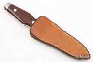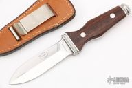 This is a very attractive boot knife from AG Russell. This is the older model made in Solingen, Germany. Blade is mirror polished with .150" thick and 1.089" deep at the ricasso, Rosewood scales. Integral construction with aluminum pins. Comes with brown leather sheath with clip. Excellent condition.