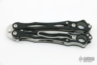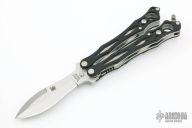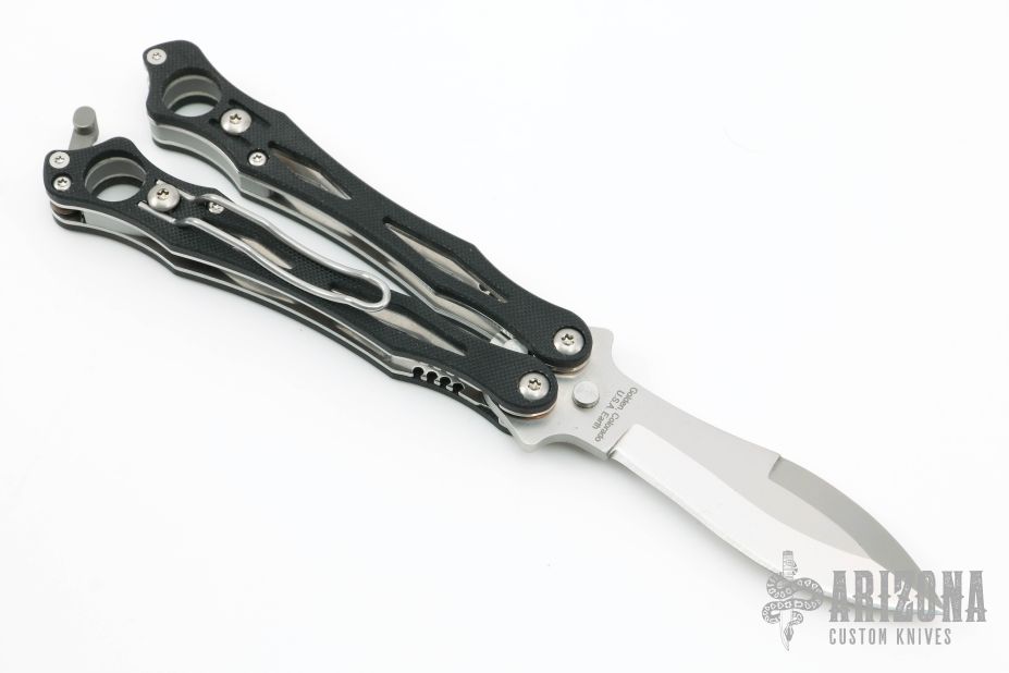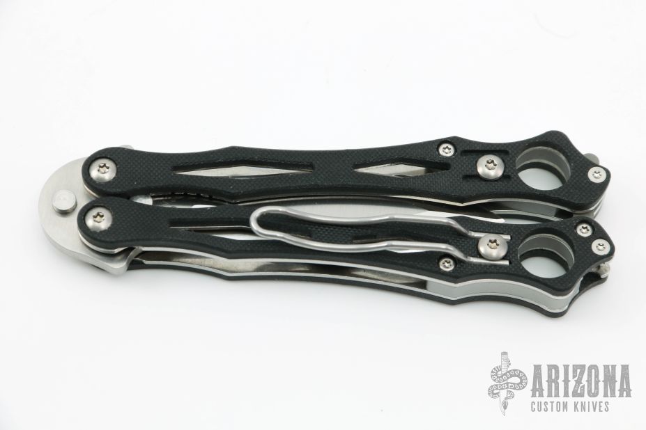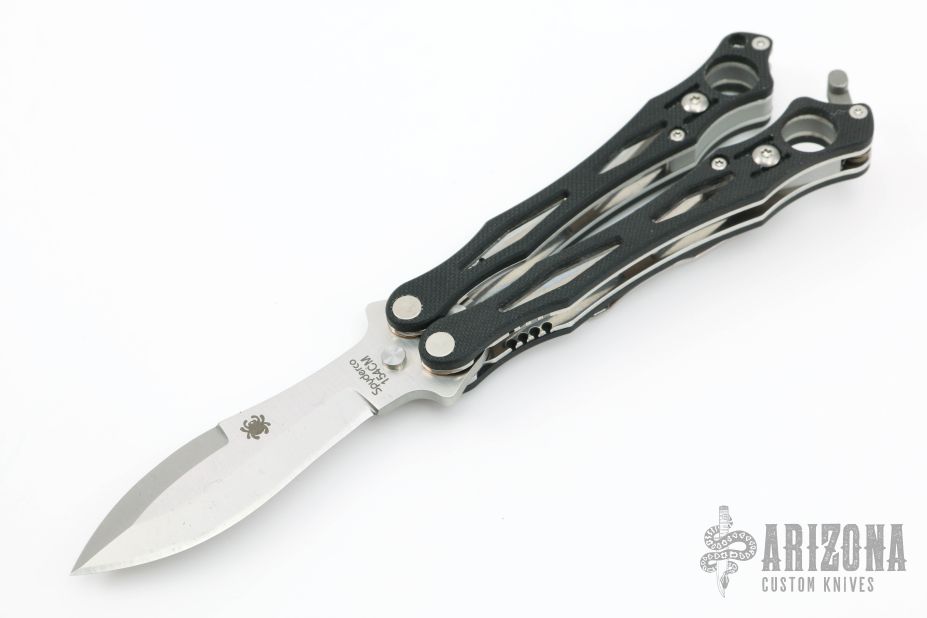This Spyderfly Balisong by Spyderco has a satin finished spear point blade with false top edge. Handle is black G10 over stainless steel liners and stainless steel paper-clip style pocket clip. Comes with original box and papers.  Excellent condition.