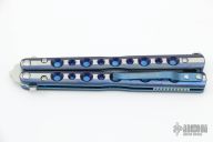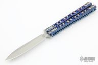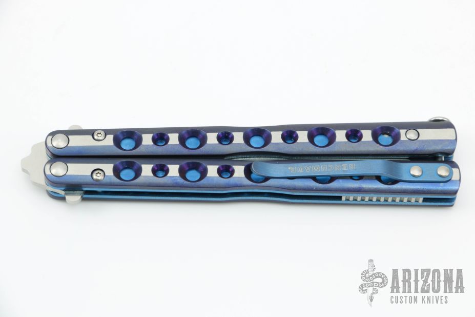 This Model 51 Morpho Balisong from Benchmade has a tumble finished D2 stainless steel spear point blade. Handle has anodized titanium scales by Flytanium, with anodized liners and clip. Comes with drawstring pouch and original box and papers, and original scales. Excellent condition.