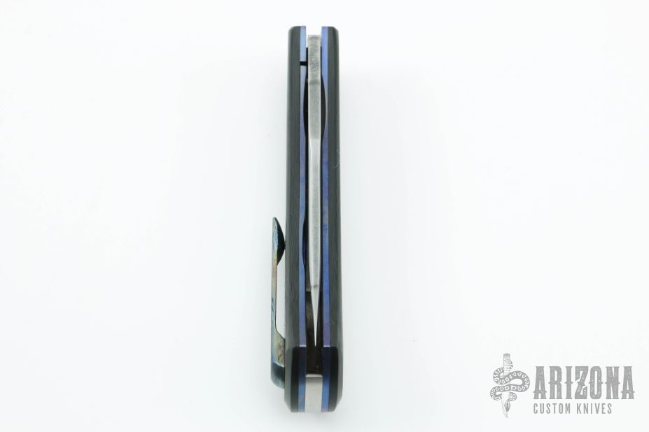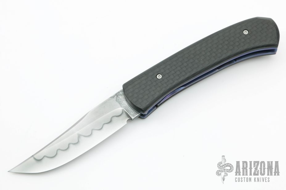 This Scale Release Auto #1 by Chuck Gedraitis features a handrub satin finish clip point blade with hamon, The handle has carbon fiber scales with satin finished anodized titanium liners, stainless steel and titanium backspacers. Nice action, lockup and blade seating. Comes with zippered case and COA. Excellent condition.