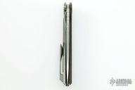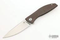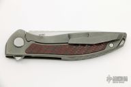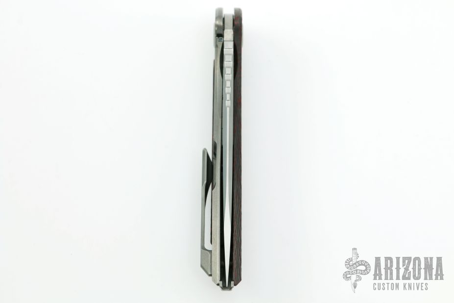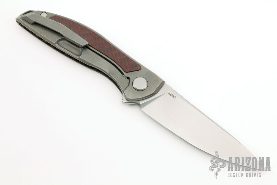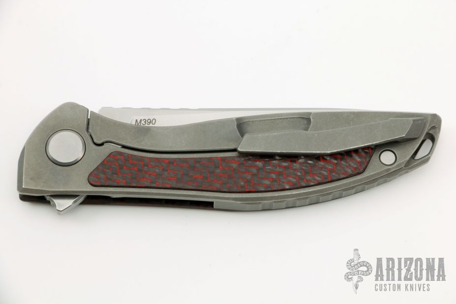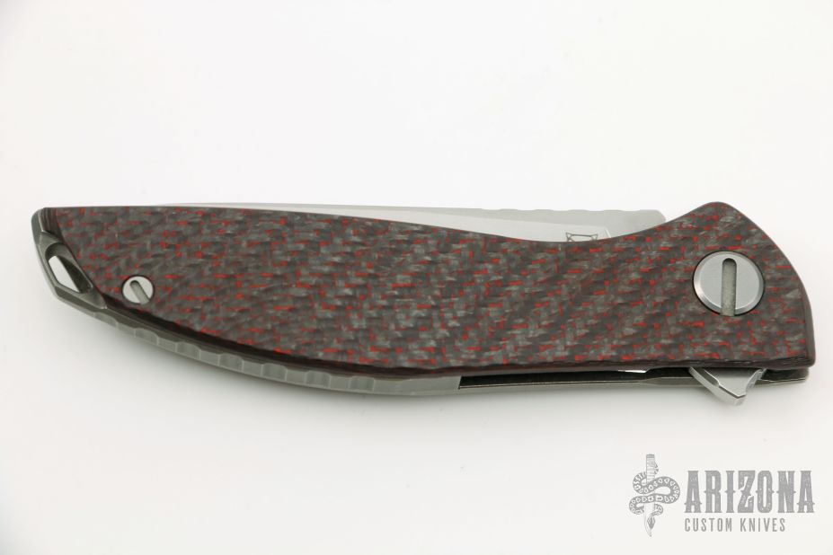 This HatiOn Zero by Shirogorov Knives features a tumble finished drop point blade with flipper. The handle is comprised of a milled Red Carbon Fiber "A" side and a tumbled titanium lockside with carbon fiber inlay, a titanium backspacer with recessed lanyard bail. 3D Machined titanium pocket clip is positioned for right hand, tip up carry. Comes with original box and papers. Rides on MRBS. Has some light scratches, otherwise excellent condition.