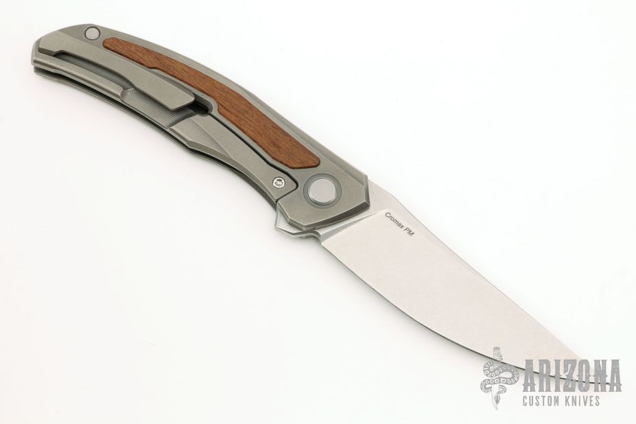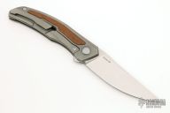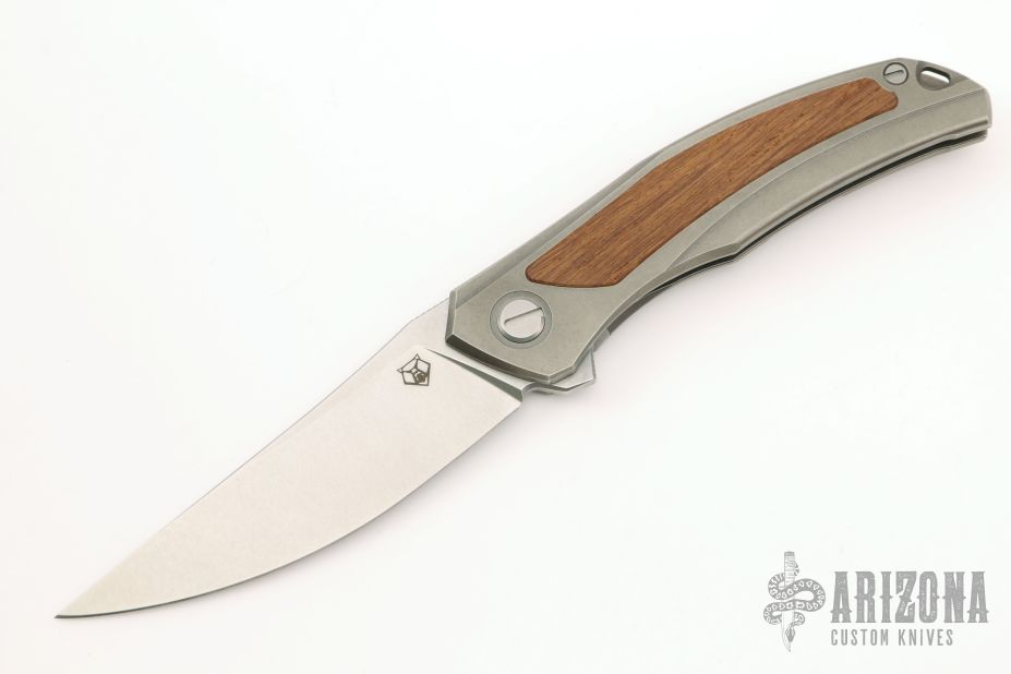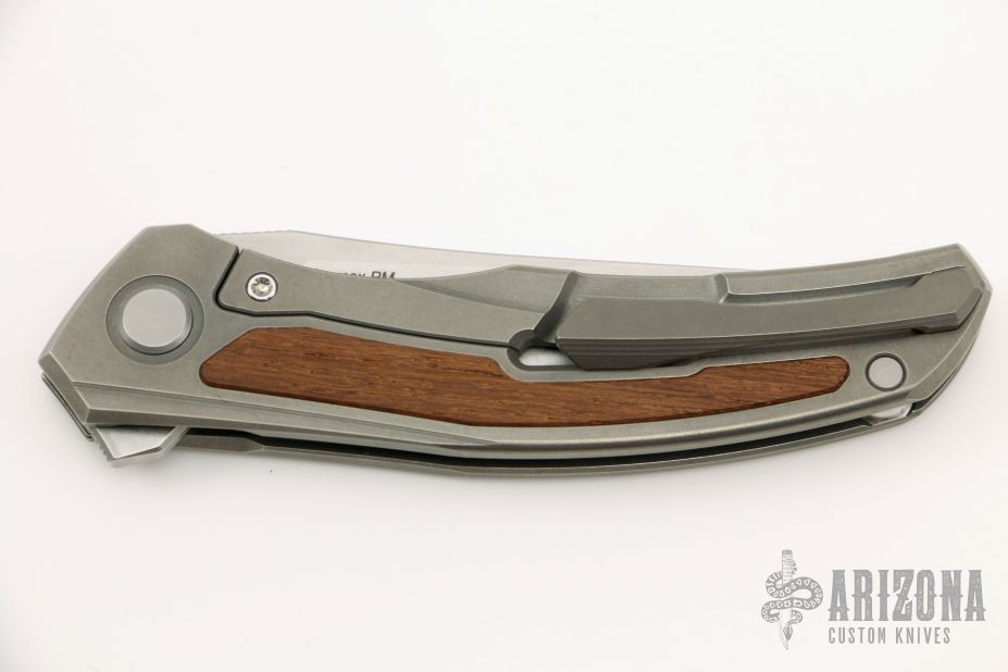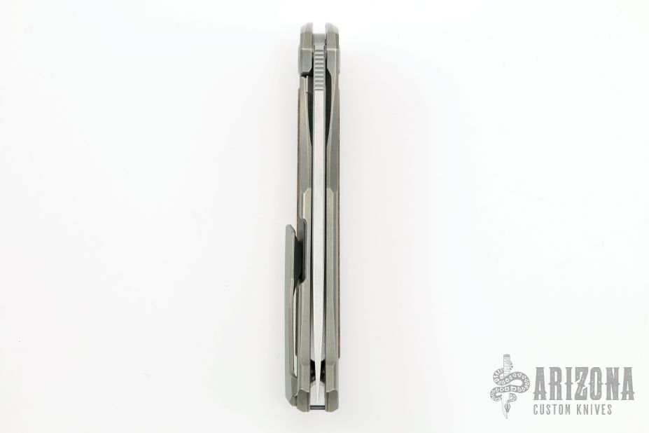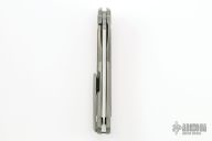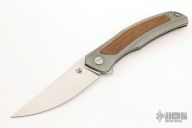 This Quantum Ursus NL by Shirogorov features a tumble finish blade with notched thumbrest and flipper. The handle has a blasted and milled titanium frame, wood inlay (what the COA says, does not specify type), backspacer, tip up titanium clip with hidden screws. Rides on SRBS, nice detent, lockup and blade seating. Comes with original box and COA. Excellent condition. Cromax PM blade steel.