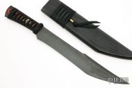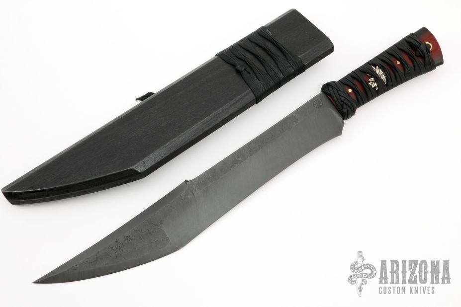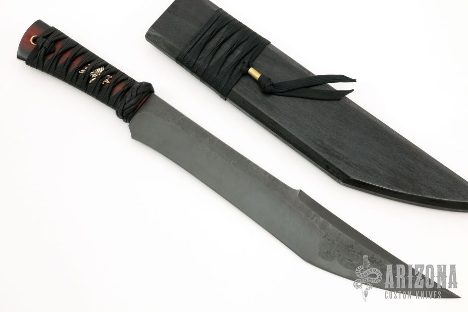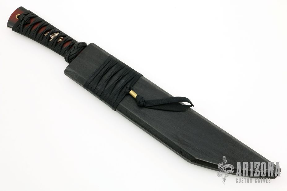 This Meridian Autumn by Tristen Knight features a hand forged black out finished blade with a false top edge, .235" blade stock and 2.025" blade depth, full tapered tang construction. The handle has nicely shaped red/black G-10 scales with brass pins, black cord wrap and a silver menuki. Comes with a zippered case and COA. Comes with a wooden scabbard with black cord wrap. New from maker.
