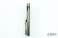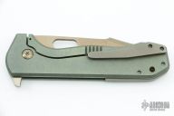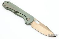 This Tac 4 by Jeremy Horton features the Lee Williams Kickstop, it has a bronzed chisel ground blade with a convex grind tip and thumbhole. The handle has an anodized and tumble finished titanium frame with a matching tip up clip and backspacer. Comes with a zippered case. Has nice detent, blade seating and lockup. Excellent condition. 1 of 3 that were made.