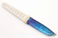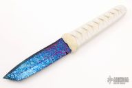 This Tanto One-Off by Sam Eddleman features a Bertie Rietvelt tanto blade with false top edge, .182" blade stock and 1.232" blade depth, hidden tang construction. Handle is wrapped in a traditional Japanese style using epoxy soaked nylon cord over white rayskin. Knife is in excellent condition, shows no signs of use.