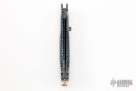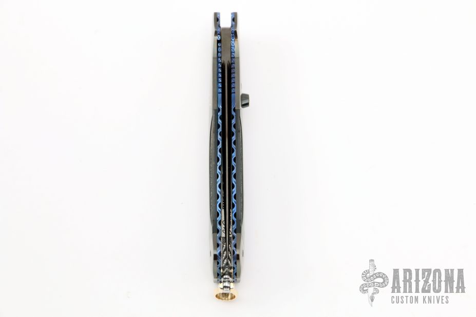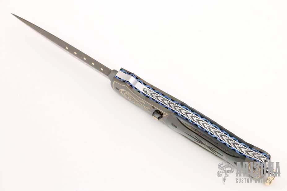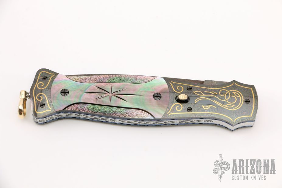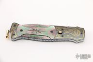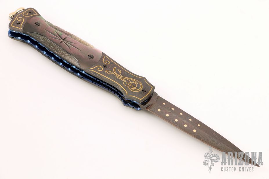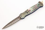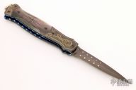 This Small Symmetrical Auto Dagger by Larry Newton features a hot blued Vegas Forge Damascus blade with 10 14kt gold dot inlays. The handle has matching hot bled Damascus bolsters front and rear with 24kt gold inlays, engraved rocker bar with checkered 24kt gold button and 24kt gold inlays, beautifully carved black lip pearl scales, handmade and engraved clocked screws, anodized and fileworked titanium liners, engraved stainless steel backspacer inside and out. Makers mark is engraved inside the backspacer as well. Nice smooth action, lockup and blade seating. Comes with COA and velcro case. New condition. This knife is stunning and perfect in every way. Don't miss out on this one.