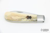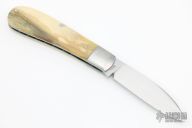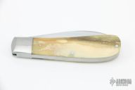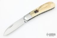 This slipjoint by Chris Taylor features a hand rub satin finished blade with a nail nick. The handle has pinched stainless steel bolsters, mammoth ivory covers, mammoth ivory escutcheon, stainless steel liners and spring, stainless steel pins. Has half-stop, flush in all positions. Comes with a zippered case. Excellent condition.