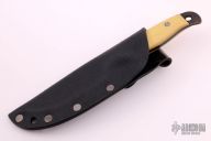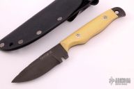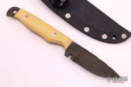 This Knife by Barry Dawson features a black blade with a notched thumbrest and fileworked spine, .120" blade stock and .949" blade depth, full tang construction. The handle has Westinghouse yellow paper micarta scales with mosaic pins, extended tang with lanyard hole, also a flathead screwdriver. Comes with a kydex sheath with belt clip and a zippered case. Excellent condition.