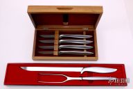 This carving set by Gerber features a carving fork and knife. Mirror polished fork and knife with .063" blade stock and .611" blade depth, hidden tang construction. 8.75" blade and 14.25" overall. Comes with original box and papers dated 9/84. New condition. Never used.