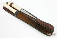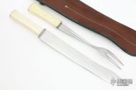 This Carving Set by Metala Co. features a mirror polished blade with .084" blade stock and 1.437" blade depth, hidden tang construction. The handle has a nickel silver guard, bone grip and a stainless steel butt. Comes with a matching carving fork. Both come in a brown leather sheath with deer skin overlay. Excellent condition.