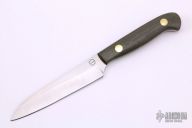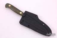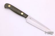 This K-49 Paring Knife by Dozier Knives features a satin finished blade, .092" blade stock and .948" blade depth, full tang construction. The handle has green linen micarta scales with brass pins and lanyard hole. Comes with a right hand horizontal kydex sheath. New from maker.