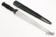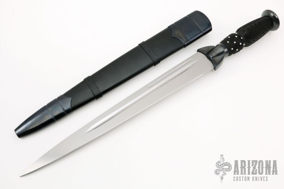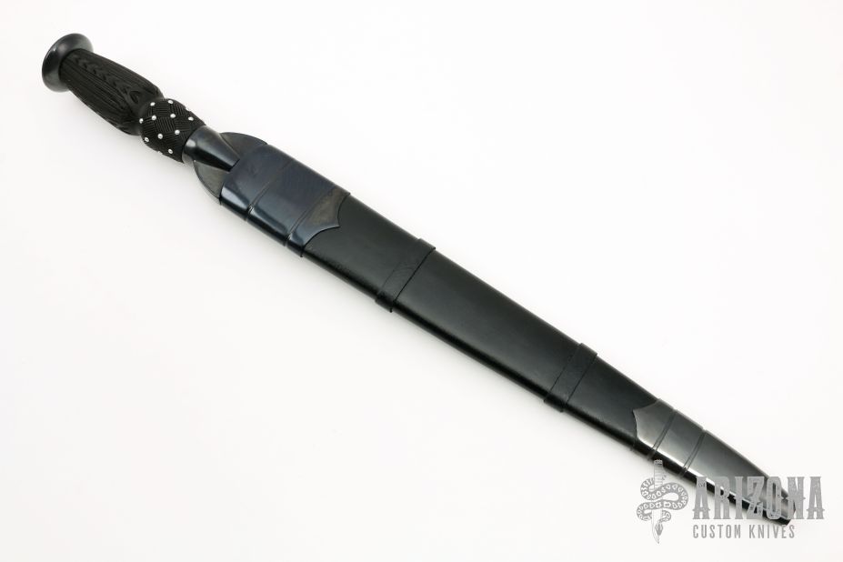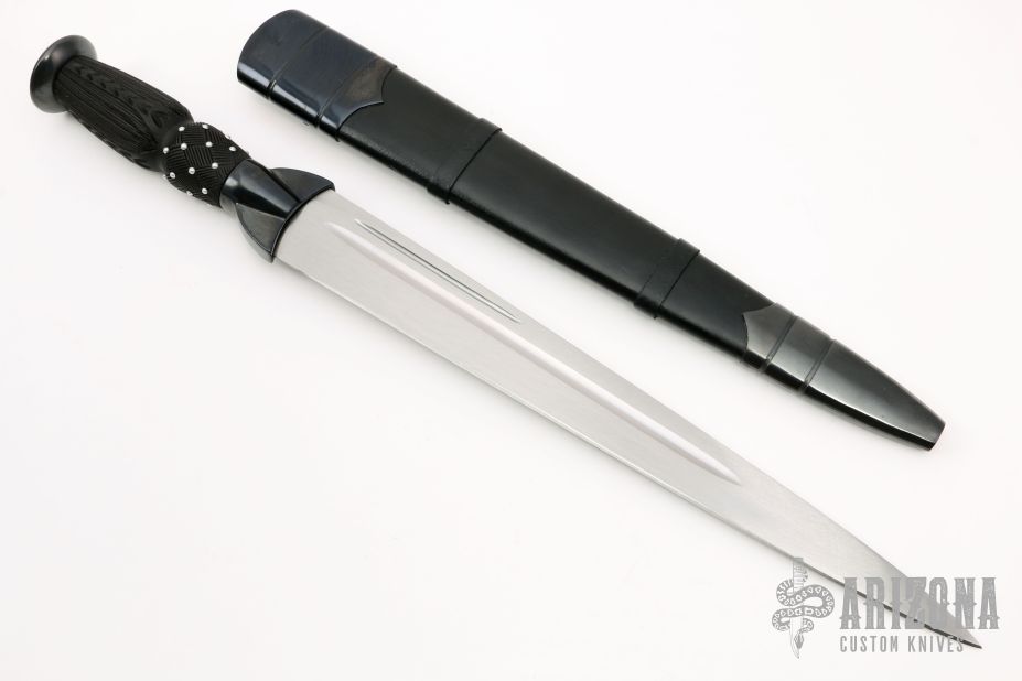 This Scottish Dirk by Cold Steel features a satin finished blade with polished fullers, .205" blade stock and 1.626" blade depth, hidden tang construction. The handle has a black steel guard and butt with carved black rosewood grip and nickel silver studs. Comes with a black scabbard. Has some light scratches, otherwise excellent condition.