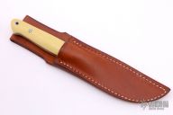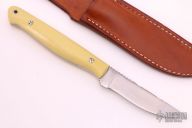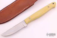 This hunter by Lynn Dawson features a satin finished blade with notched thumbrest, .120" blade stock and .773" blade depth, full tang construction. The handle has yellow paper micarta scales with mosaic pins and lanyard hole. Comes with a brown sheath made by knife maker Jay Gordon. Comes with a zippered case. This knife was sent to Jay Gordon for a sheath, in that time, it got a little tarnished, he attempted to clean it up, but never got around to re-etching the logo, and that is how it came to be like this. Good user condition.