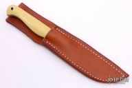This hunter by Lynn Dawson features a satin finished blade with notched thumbrest, .120" blade stock and .773" blade depth, full tang construction. The handle has yellow paper micarta scales with nickel silver pins and lanyard hole. Comes with a brown sheath made by knife maker Jay Gordon. Comes with a zippered case. This knife was sent to Jay Gordon for a sheath, in that time, it got a little tarnished, he attempted to clean it up, but never got around to re-etching the logo, and that is how it came to be like this. Good user condition.