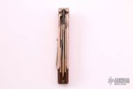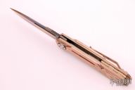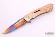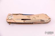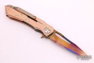 This Mini Mina by Dew Hara features a 15 layered VG-10 Core San Mai Damascus blade with Aurora finish, notched thumbrest and flipper. The handle has a satin finished and engraved copper frame and liners with a titanium tip up clip. #014. Comes with original box, pouch and papers. Excellent condition.