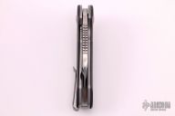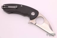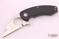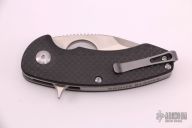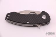 "The Silent Soldier Flipper features a satin finished steel blade with a Wharncliffe style profile. The blade has a double ground, double swedge. The spine has aggressive thumb jimping and a 7/8" finger hole in the blade for ultimate control with various grip styles. The pivot utilizes a ball bearing system and heat treated pivot and stop pin. The handle has 6al4v titanium liners, carbon fiber scales. Bead blast finished stainless steel back spacer and pocket clip" Flipper opening mechanism. #170 of 500. Excellent condition.