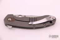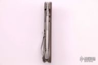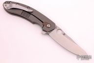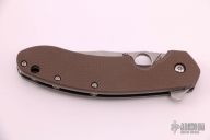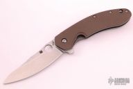 This Southard framelock flipper by Spyderco Knives features a tumbled blade with a notched thumbrest, thumbhole, and flipper. The handle has a textured brown G-10 scale with a tumbled titanium liner and titanium scale with brown G-10 around the pivot screw and a stainless steel clip, tip up carry. Excellent condition.