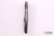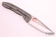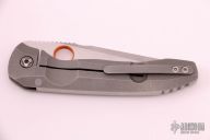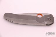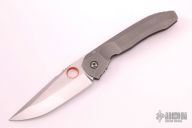 This Large Nirvana by Peter Rassenti features a satin finished clip point blade with an orange G-10 inlaid thumbhole and notched thumbrest. The handle has an integral textured titanium frame with a matching titanium clip, tip up carry. Nice detent, lockup and blade seating. Comes with zippered case. Excellent condition.