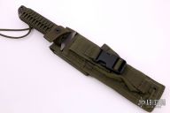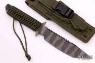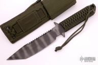 The BN-SS by Strider features a tiger stripe DUB tanto blade with a serrated top edge .248" blade stock and 1.490" blade depth, full tang construction. The handle has a green paracord wrapped handle. Comes with a green nylon sheath. Has a couple light scuffs, otherwise excellent condition.