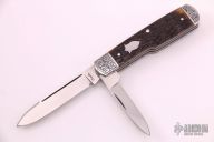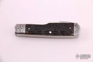 This Gunstock by Joel Chamblin features 2 hand rubbed satin finished blade both with a single nail nick. The handle has engraved stainless steel bolsters done by SM Lytton, jig bone covers with a stainless steel escutcheon, stainless steel liners and spring. Has half-stop, flush in all positions. Excellent Condition. Comes with a small velcro case.