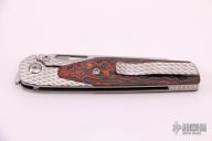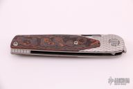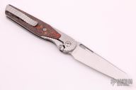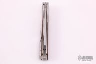 This Cortex by Brown Knives features a clip point stonewashed polish finish blade with notched thumbrest and flipper. The handle has a milled titanium frame with integral bolsters, inlaid scales, backspacer and tip up clip with hidden screws. Rides on bearings, nice detent, lockup and blade seating. Comes with original box and COA #351. New from Maker.