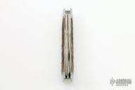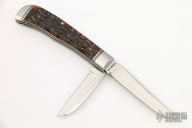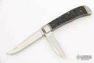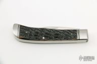 This slipjoint folder by Russell Easler features 2 hand rub satin finished blades with nail nicks. The handle has satin finished and threaded stainless bolsters, stainless steel liners and springs, jigged bone covers. Half stop on blades, flush in the open and closed positions. Excellent condition. Comes with a zippered case.