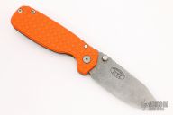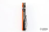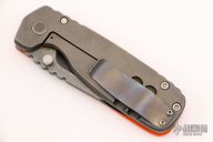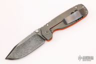 This Left Handed Framelock by Jason Stout features a tumbled chisel ground blade with dual thumbstuds, fullers and notched thumbrest. The handle has a frag pattern orange G-10 and orange peel finished titanium frame with matching titanium clip for tip up carry, matching titanium backspacer. Nice detent, lockup and blade seating. Rides on bearings, nice detent, lockup and blade seating. Excellent condition. Comes with a zippered case.