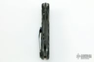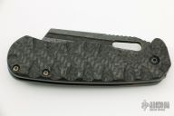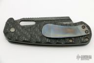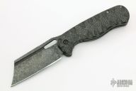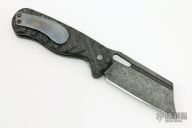 This Micro Butcher Linerlock By Jason Stout features a dark stonewashed blade with notched thumbrest and a thumbhole. The handle has sculpted carbon fiber scales, orange peel finished and anodized titanium liners and tip up clip. Nice detent, lockup and blade seating. Has some oxidation spots on the blade, otherwise good condition. Comes with a zippered case.