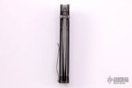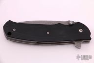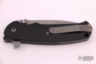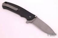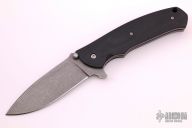 This Blast Flipper by Ray Laconico features a dark tumble finished blade drop point blade with swedge, dual thumb studs, notched thumb ramp and flipper. The handle is comprised of black G10 scales over tumbled titanium liners and black G10 backspacer, tip up tumbled titanium clip. Has a few light scuffs, otherwise excellent condition.
