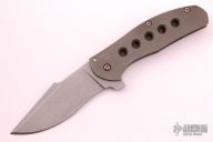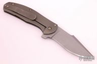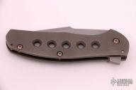 This Large Bear Flipper features a tumble finished blade with flipper. The handle has a tumble finished titanium frame with matching tip up clip and a moonglow backspacer, has a lanyard hole. Nice detent, lockup and blade seating. Has some scratches on the clip, otherwise excellent condition.