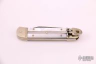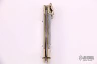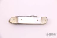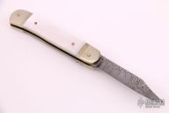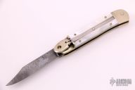 This Lever Lock Automatic by Hubertus Knives features a Damascus clip point blade. The handle is comprised of nickel silver double bolsters and lever with MOP scales over brass liners and steel backspacer. Has a couple light scratches, the knife does not deploy fully when fired (this may be able to be worked out, but I am not able to), otherwise good condition.