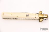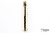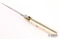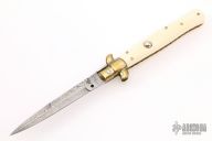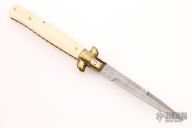 This Swivel Bolster from AB Italy features a Damascus bayonet ground blade with fileworked spine. The handle is comprised of brass bolsters, mammoth ivory scales over fileworked brass liners and fileworked stainless steel backspacer. Excellent condition.