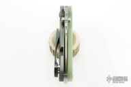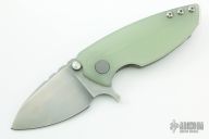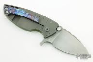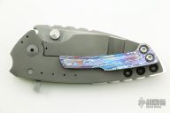 This Hyper 90 from Direware Custom Knives features a matte hand rub satin finished blade with notched thumbrest and dual thumbstuds. The handle is comprised of a translucent G-10 scale and bead blasted titanium frame, stainless steel backspacer, MokuTi tip up clip. Comes with a zippered case. Excellent Condition.