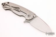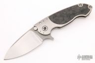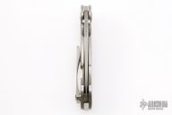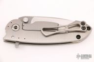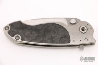 This Solo Flipper by Direware features a hand rub satin finished blade with notched thumbrest and a flipper. The handle has a satin finished titanium frame with marble carbon fiber inlay, matching tip up titanium clip, titanium pivot and stainless steel backspacer. Comes with original box. Rides on bearings, nice detent, lockup and blade seating. Excellent condition.