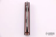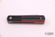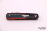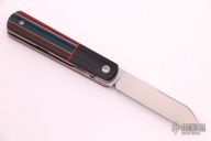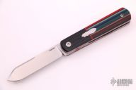 This Barlow Front Flipper by Enrique Pena features a hand rub satin finished blade with swedge, notched thumbrest and front flipper. The handle has black canvas micarta bolsters, Mexican Blanket canvas micarta scales over red liners, titanium liners, natural canvas micarta backspacer. Stainless Steel Shield.  Includes padded and zippered case. New from maker.