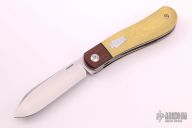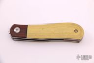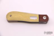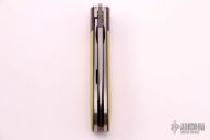 This Dogleg Front Flipper by Enrique Pena features a hand rub satin finished drop point blade with a notched thumbrest and front flipper. The handle has brown canvas micarta bolsters, yellow paper micarta scales over black liners, titanium liners, brown canvas micarta backspacer.  Stainless steel shield. Includes padded zippered case. Very small scratch on the shield, tiny black mark on b-side. Otherwise excellent condition.