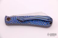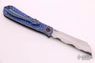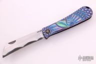 This Caipira Slipjoint by Rick Lala of Korth Cutlery features a hawkbill San Mai Damascus blade with nail nick and notched thumbrest. The handle has an orange peel finished titanium frame with matching spring, tip up orange peel finished titanium clip, lanyard hole. The handle has been carved by Rudy Lala. Has half-stop. Comes with zippered case. New from maker.